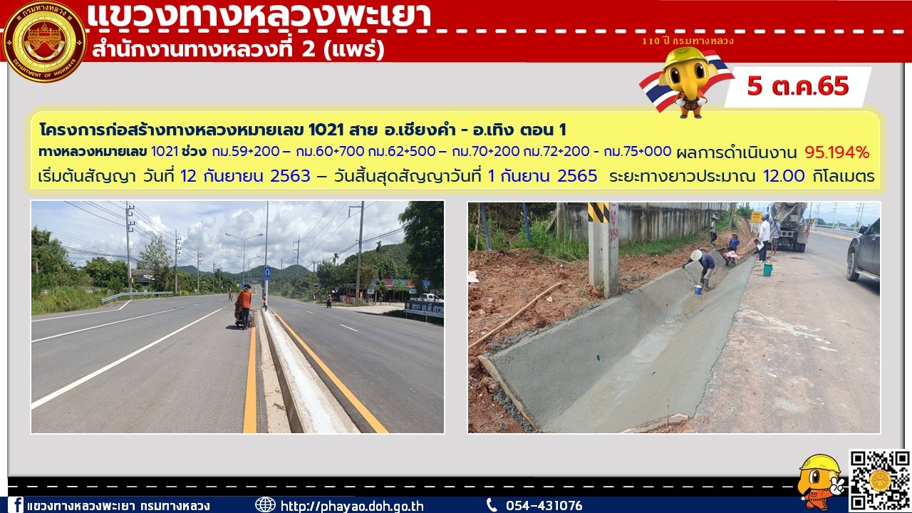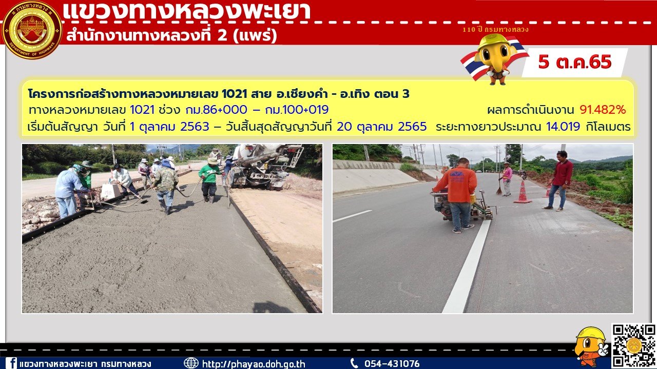 กรมทางหลวงเร่งขยายทางหลวง 1021 ตอน อ.เชียงคำ จ.พะเยา - อ.เทิง จ.เชียงราย เป็น 4 ช่องจราจร รองรับถนนสายเศรษกิจ R3A เชื่อมโยงการคมนาคมกลุ่มประเทศอนุภาคลุ่มแม่น้ำโขง
