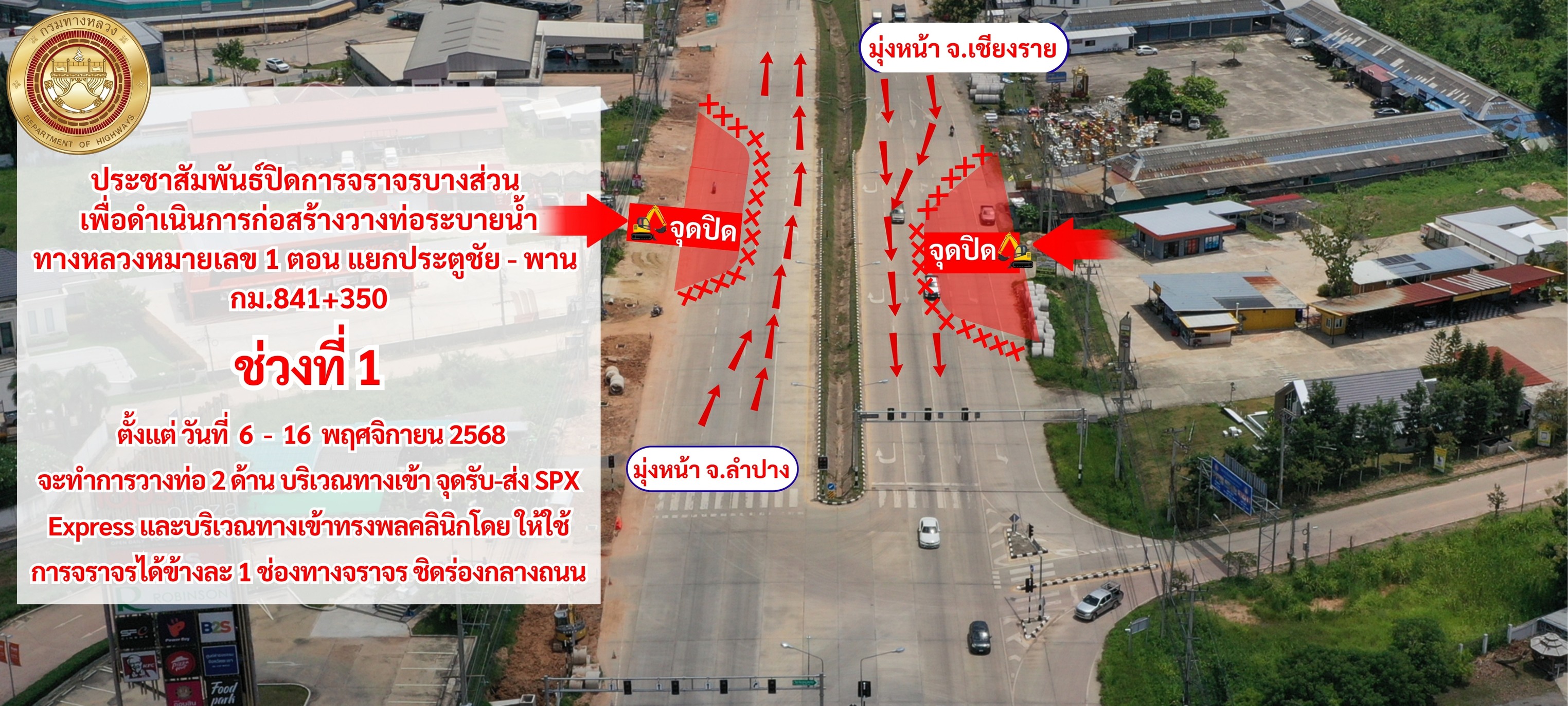 แจ้งปิดการจราจรบางส่วนในระหว่างดำเนินการก่อสร้าง เนื่องด้วยโครงการกิจกรรมแก้ปัญหาการระบายน้ำที่ส่งผลกระทบกับการจราจรบนโครงข่ายทางหลวง ทางหลวงหมายเลข 1 ตอนแยกประตูชัย - พาน ระหว่างกม.839+900 - กม.842+000 จะทำการปิดช่องจราจรเพื่อทำการก่อสร้างวางท่อระบายน้ำ คสล.(ใหม่) พร้อมทำโครงสร้างชั้นทางใหม่จนถึงผิวทางคอนกรีต ความหนา 25 cm. และเกาะกลาง (CURB AND GUTER 0.50 M.WIDTH) ทดแทนผิวทางเดิมและเกาะกลางที่ขุดออกคืนสู่สภาพเดิม ช่วงกม.841+350 จำนวน 2 ช่วง เวลา