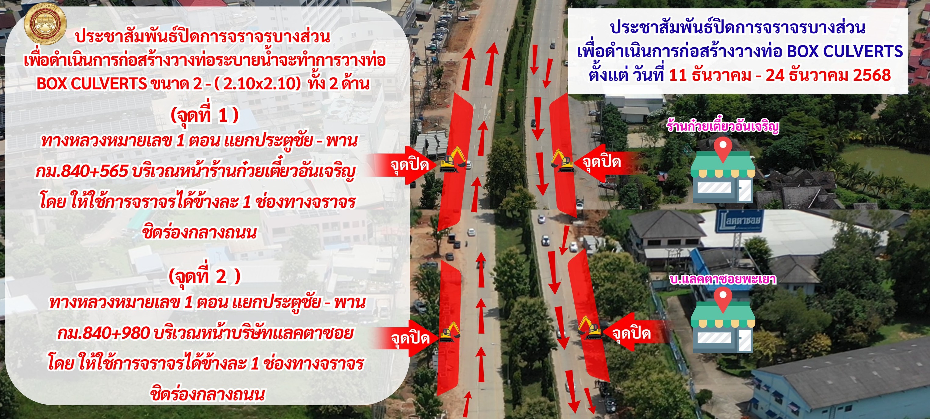 แจ้งปิดการจราจรบางส่วนในระหว่างดำเนินการก่อสร้าง เนื่องด้วยโครงการกิจกรรมแก้ปัญหาการระบายน้ำที่ส่งผลกระทบกับการจราจรบนโครงข่ายทางหลวง ทางหลวงหมายเลข 1 ตอนแยกประตูชัย - พาน ระหว่างกม.839+900 - กม.842+000 จะทำการปิดช่องจราจรเพื่อทำการก่อสร้างวางท่อระบายน้ำ คสล.(ใหม่) พร้อมทำโครงสร้างชั้นทางใหม่จนถึงผิวทางคอนกรีต ความหนา 25 cm. และเกาะกลาง (CURB AND GUTTER 0.50 M.WIDTH) ทดแทนผิวทางเดิมและเกาะกลางที่ขุดออกคืนสู่สภาพเดิม ช่วงกม.841+350 จำนวน 2 จุด