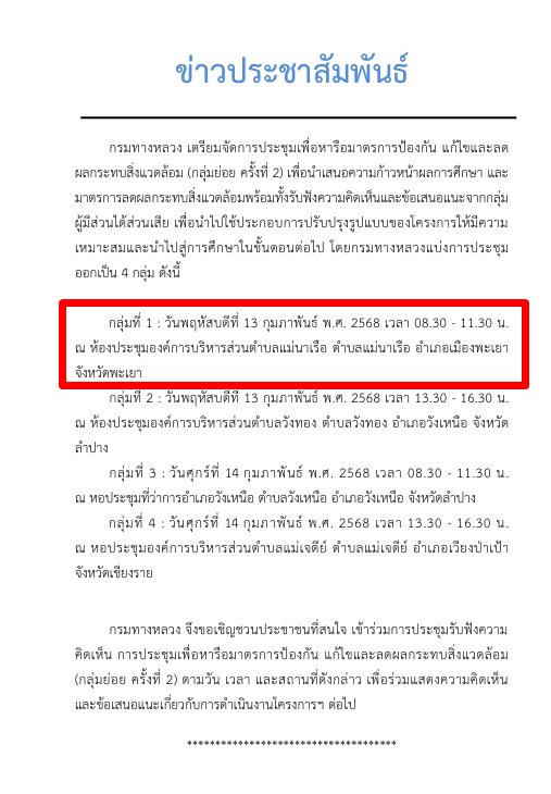 ขอเชิญเข้าร่วมการประชุมเพื่อหารือมาตรการป้องกัน แก้ไขและลดผลกระทบสิ่งแวดล้อม (กลุ่มย่อย ครั้งที่ 2) โครงการจ้างวิศวกรที่ปรึกษา สำรวจและออกแบบทางหลวง 4 ช่อง จราจร บนทางหลวงหมายเลข 120 ต.แม่นาเรือ ต.วังเหนือ (กล่มที่ 1 ) วันพฤหัสบดี ที่ 13 กุมภาพันธ์ 2568 เวลา 08.30 – 11.30 น.