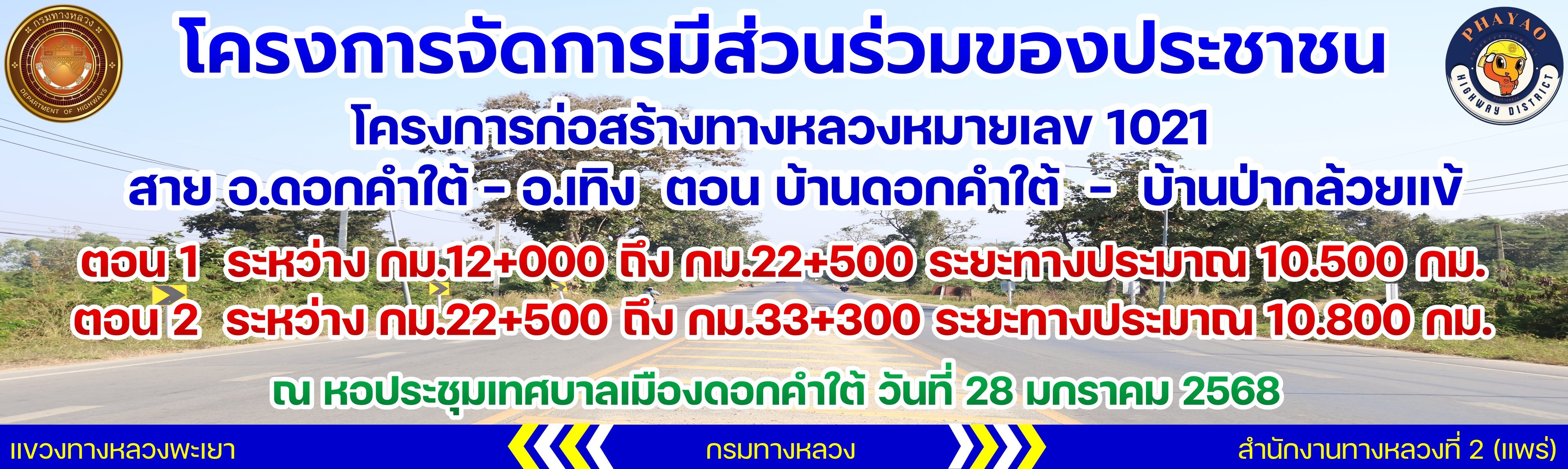 ขอเชิญผู้ที่สนใจเข้าร่วมโครงการจัดการมีส่วนร่วมของประชาชน โครงการก่อสร้างทางหลวงหมายเลข 1021 สาย อ.ดอกคำใต้ - อ.เทิง ตอน บ้านดอกคำใต้ - บ้านป่ากล้วยแข้ #ตอน 1 ระหว่าง กม.12+000 ถึง กม.22+500 ระยะทางประมาณ 10.500 กม.#ตอน 2 ระหว่าง กม.22+500 ถึง กม.33+300 ระยะทางประมาณ 10.800 กม. วันที่ 28 มกราคม 2568 เวลา 09.00 น.