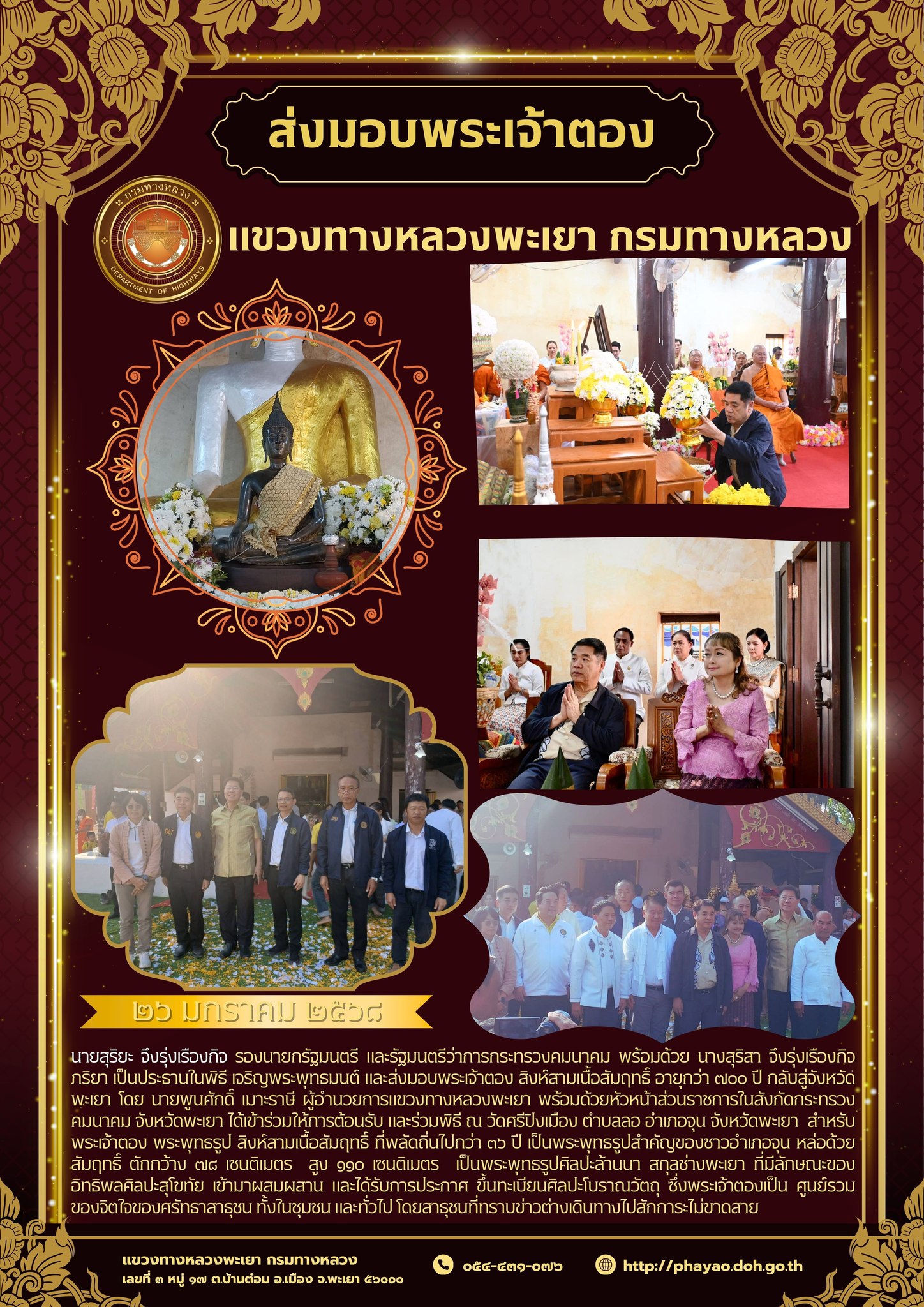 นายสุริยะ จึงรุ่งเรืองกิจ รองนายกรัฐมนตรี และรัฐมนตรีว่าการกระทรวงคมนาคม พร้อมด้วย นางสุริสา จึงรุ่งเรืองกิจ ภริยา เป็นประธานในพิธี เจริญพระพุทธมนต์ และส่งมอบพระเจ้าตอง สิงห์สามเนื้อสัมฤทธิ์ อายุกว่า ๗๐๐ ปี กลับสู่จังหวัดพะเยา โดยนายพูนศักดิ์ เมาะราษี ผู้อำนวยการแขวงทางหลวงพะเยา พร้อมด้วยหัวหน้าส่วนราชการในสังกัดกระทรวงคมนาคม จังหวัดพะเยา ได้เข้าร่วมให้การต้อนรับ และร่วมพิธี ณ วัดศรีปิงเมือง ตำบลลอ อำเภอจุน จังหวัดพะเยา