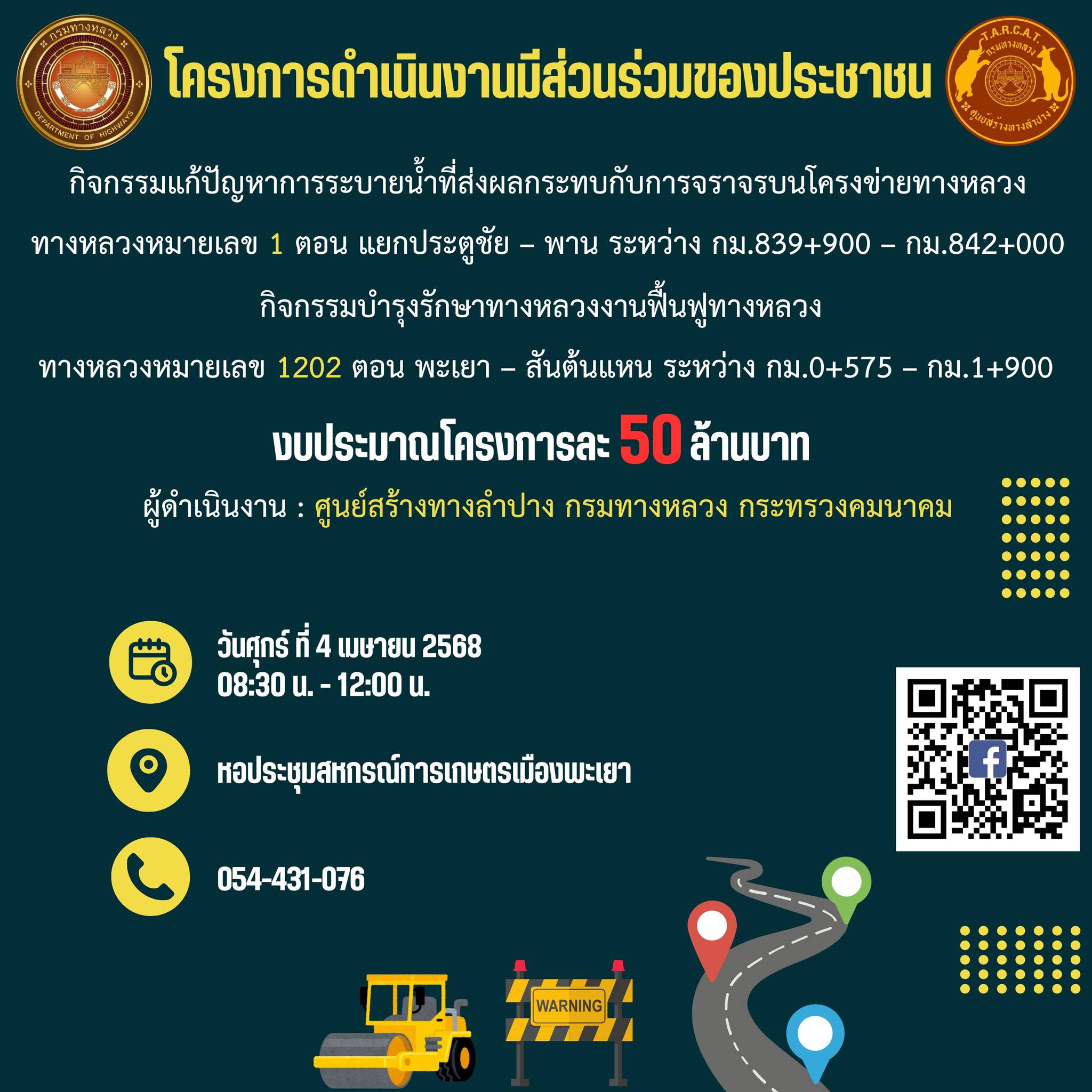 กรมทางหลวง โดยแขวงทางหลวงพะเยา เตรียมจัดประชุมการดำเนินงานการมีส่วนร่วมของประชาชน กิจกรรมแก้ปัญหาการระบายน้ำที่ส่งผลกระทบกับการจราจรบนโครงข่ายทางหลวงทางหลวงหมายเลข 1 ตอน แยกประตูชัย – พานและกิจกรรมบำรุงรักษาทางหลวงงานฟื้นฟูทางหลวง ทางหลวงหมายเลข 1202 ตอน พะเยา – สันต้นแหน จึงขอเชิญชวนประชาชนทุกท่านและผู้ที่สนใจ เข้าร่วมการประชุมการดำเนินงานการมีส่วนร่วมของประชาชน ในวันศุกร์ ที่ 4 เมษายน 2568 เวลา 08.30 น. เป็นต้นไป ณ หอประชุมสหกรณ์การเกษตรเมืองพะเยา