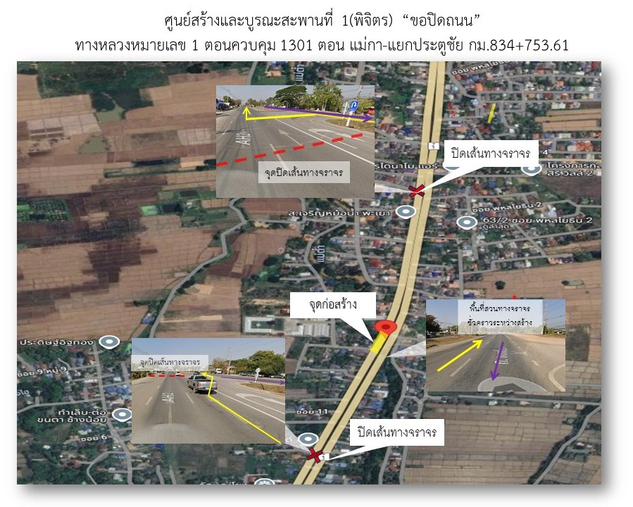 ข่าวประชาสัมพันธ์แขวงทางหลวงพะเยา ด้วยศูนย์สร้างและบูรณะสะพานที่ 1 (พิจิตร) จะดำเนินการก่อสร้างสะพาน คสล. บนทางหลวงหมายเลข 1 ตอน แม่กา - แยกประตูชัย ดำเนินการที่ กม.834+753.61 LT. และ กม.837+000.5 LT.เพื่อความปลอดภัยของประชาชนและป้องกันปัญหาการเกิดอุบัติเหตุที่อาจเกิดขึ้น จึงมีความจำเป็นต้องทำการปิดถนนในช่วงบริเวณก่อสร้างสะพาน ตั้งแต่วันที่ 21 เมษายน 2568 เป็นต้นไป จนกว่าจะดำเนินการแล้วเสร็จ