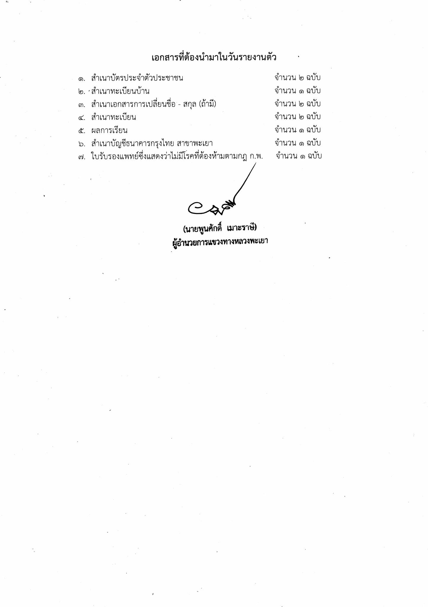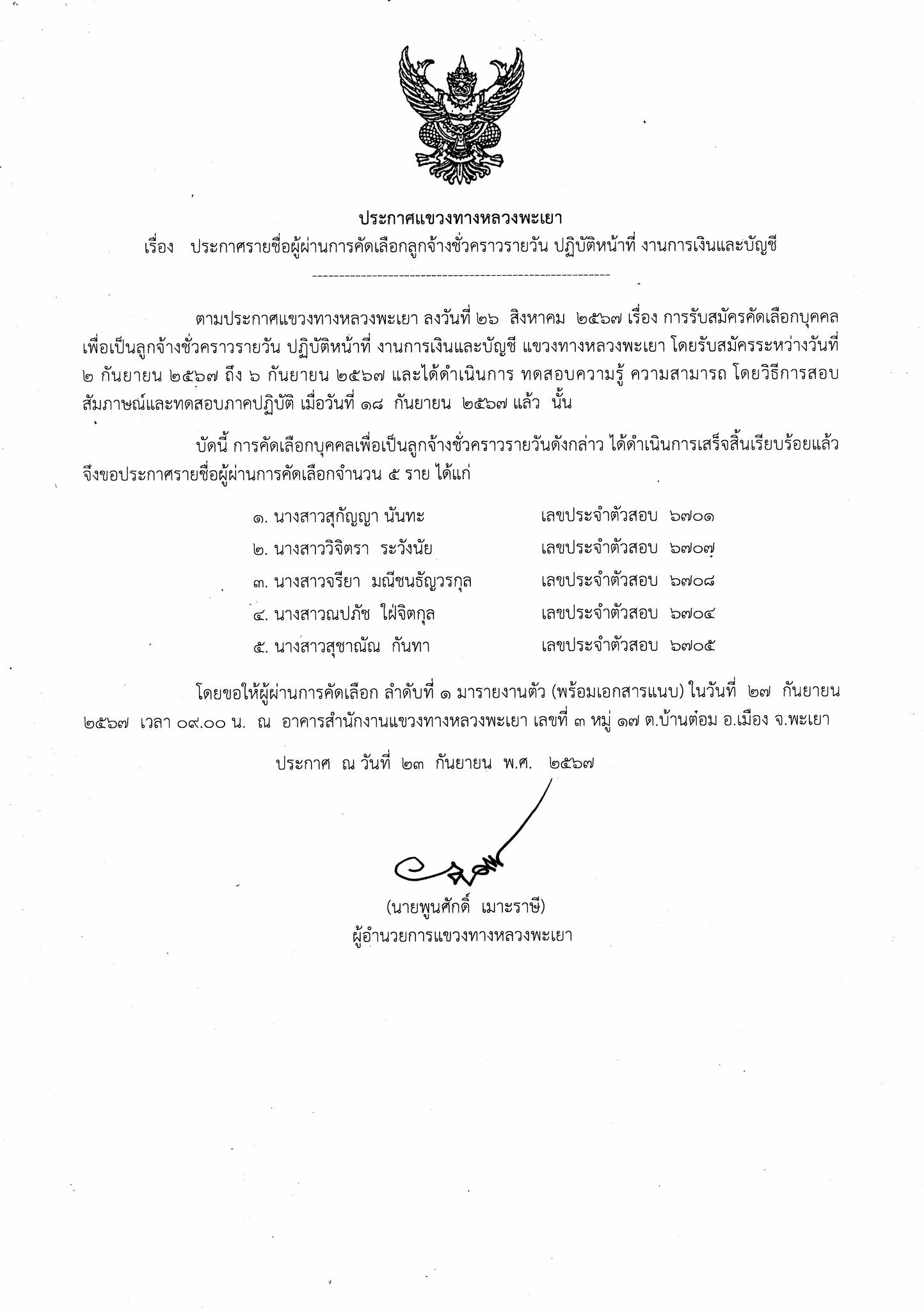 โดยขอให้ผู้ผ่านการคัดเลือก ลำดับที่ 1 มารายงานตัว(พร้อมเอกสารแนบ) ในวันศุกร์ ที่ 27 กันยายน 2567 เวลา 09.00 น. ณ อาคารสำนักงานแขวงทางหลวงพะเยา