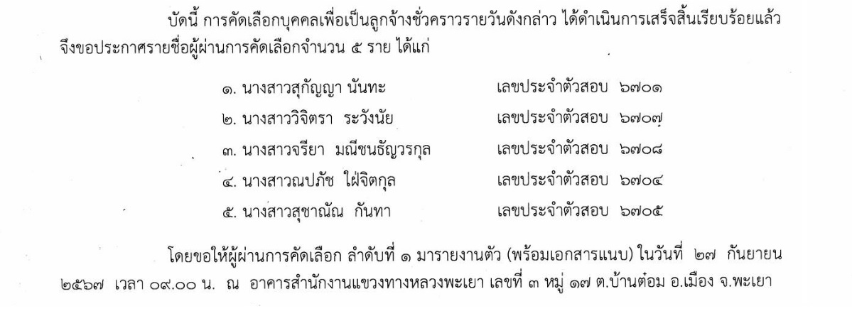 ประกาศแขวงทางหลวงพะเยา เรื่องประกาศรายชื่อผู้ผ่านการคัดเลือกลูกจ้างชั่วคราวรายวัน ปฏิบัติหน้าที่ งานการเงินและบัญชี โดยขอให้ผู้ผ่านการคัดเลือก ลำดับที่ 1 มารายงานตัว(พร้อมเอกสารแนบ)