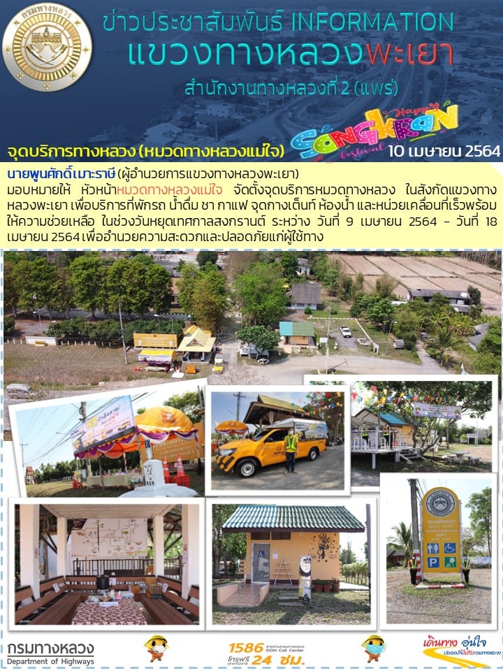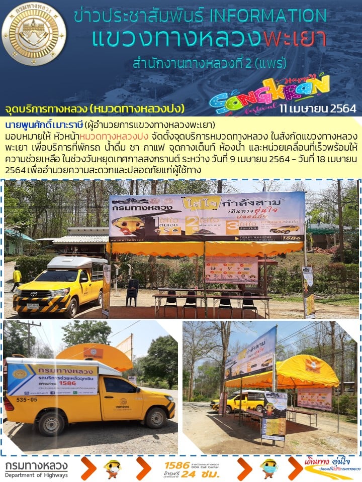 วันที่ 11 เมษายน 2564 ประชาชนที่เดินทาง แวะพักจุดบริการหมวดทางหลวง ในสังกัดแขวงทางหลวงพะเยา บริการที่พักรถ น้ำดื่ม ชา กาแฟ จุดกางเต็นท์ ห้องน้ำและหน่วยเคลื่อนที่เร็วพร้อมให้ความช่วยเหลือ ในช่วงวันหยุดเทศกาลสงกรานต์ ระหว่าง วันที่ 9 เมษายน 2564 - วันที่ 18 เมษายน 2564 เพื่ออำนวยความสะดวกและปลอดภัยแก่ผู้ใช้ทาง