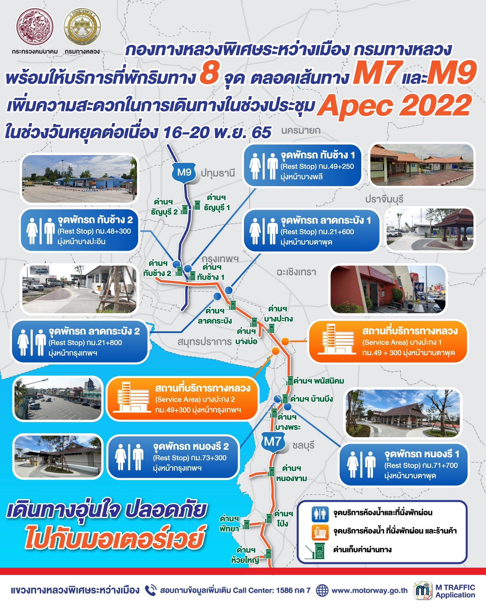 แจ้งหลีกเลี่ยงเส้นทาง มอเตอร์เวย์ ทล.7 ตั้งแต่ ทางแยกต่างระดับศรีนครินทร์ (กม. 0+000) ถึง ท่าอากาศยานสุวรรณภูมิ (ทางเข้า - ทางออก กม. 10+800) ในช่วงที่มีการจัดประชุม APEC ระหว่างวันที่ 16-18 พ.ย. 2565