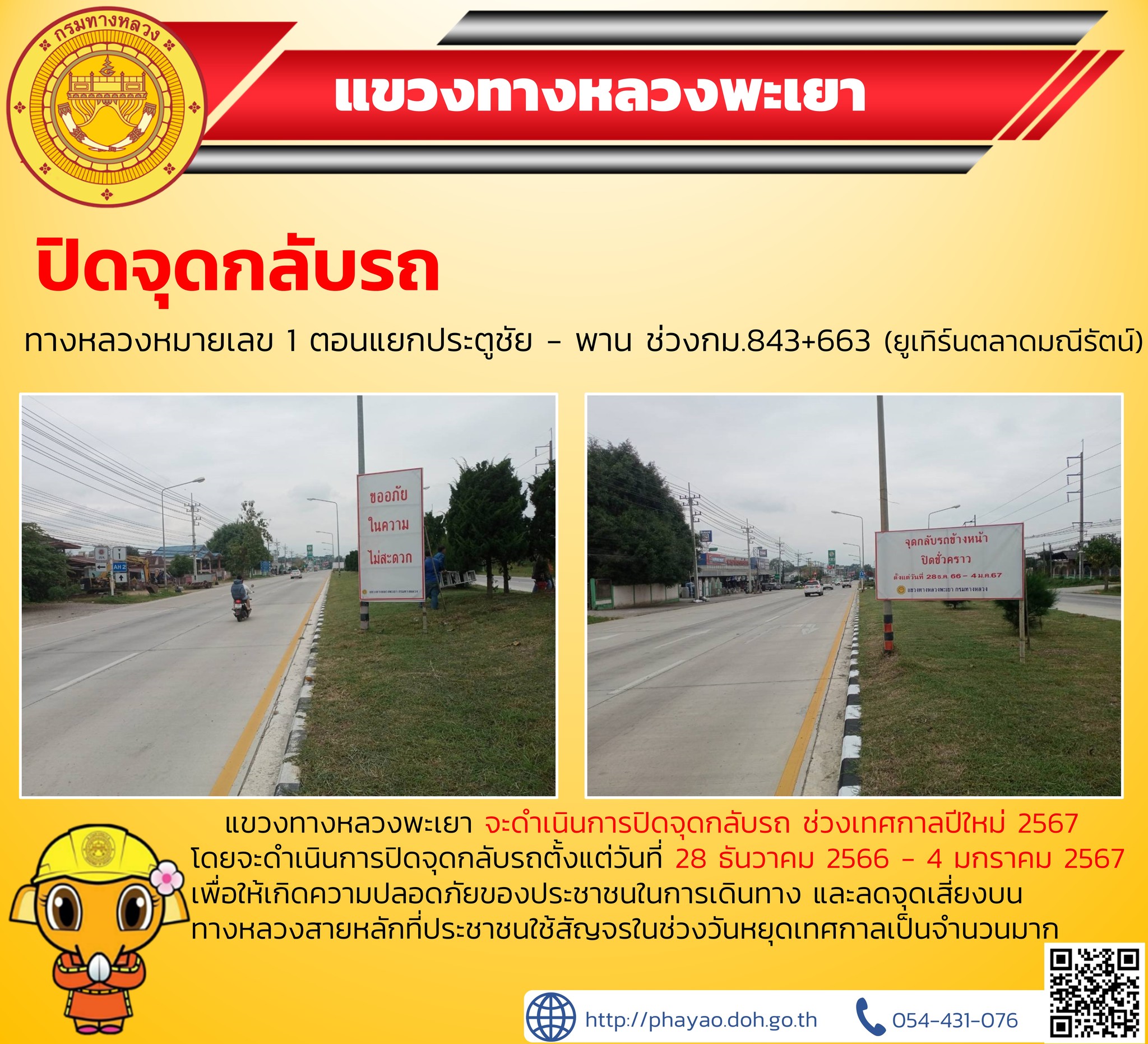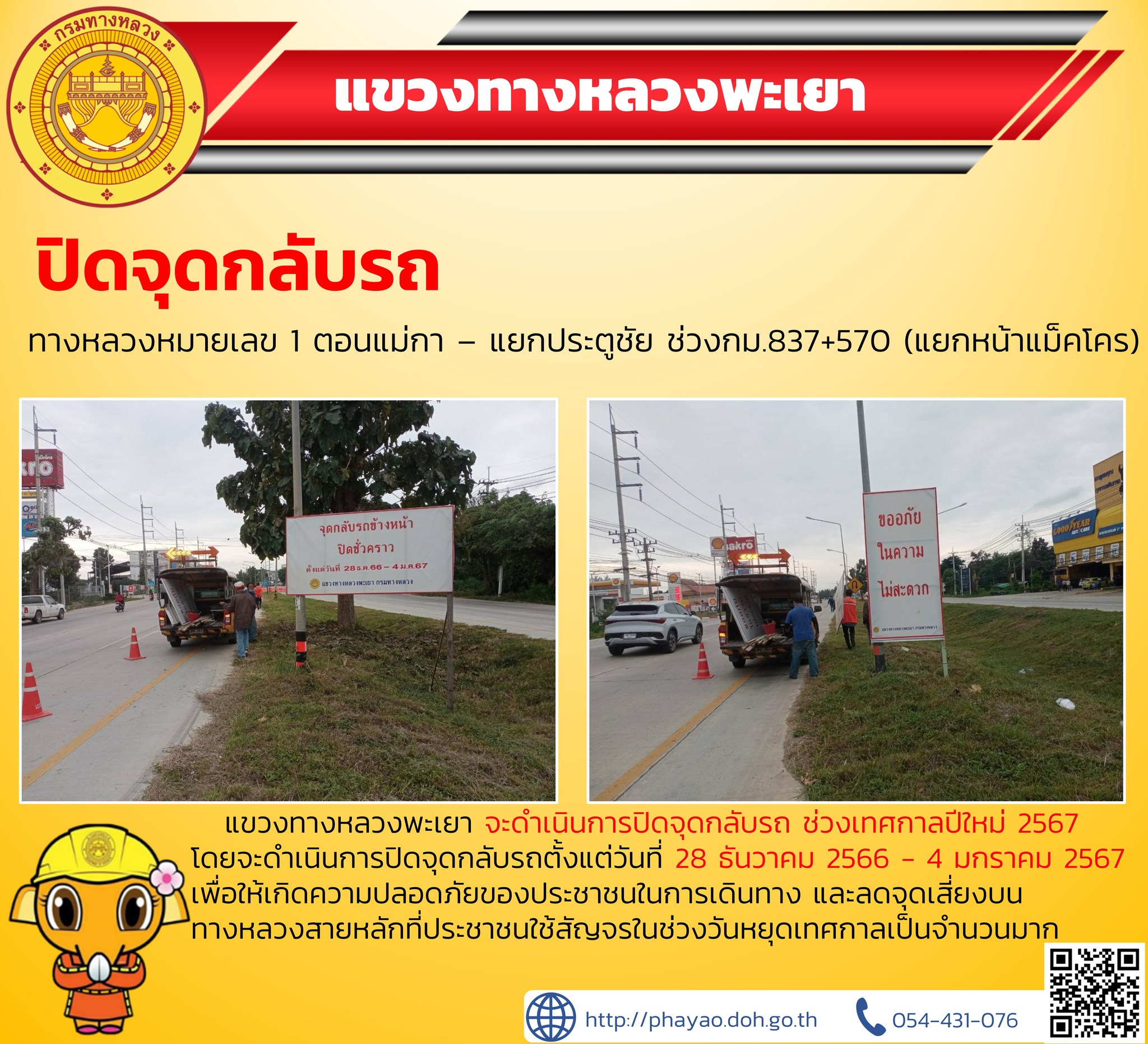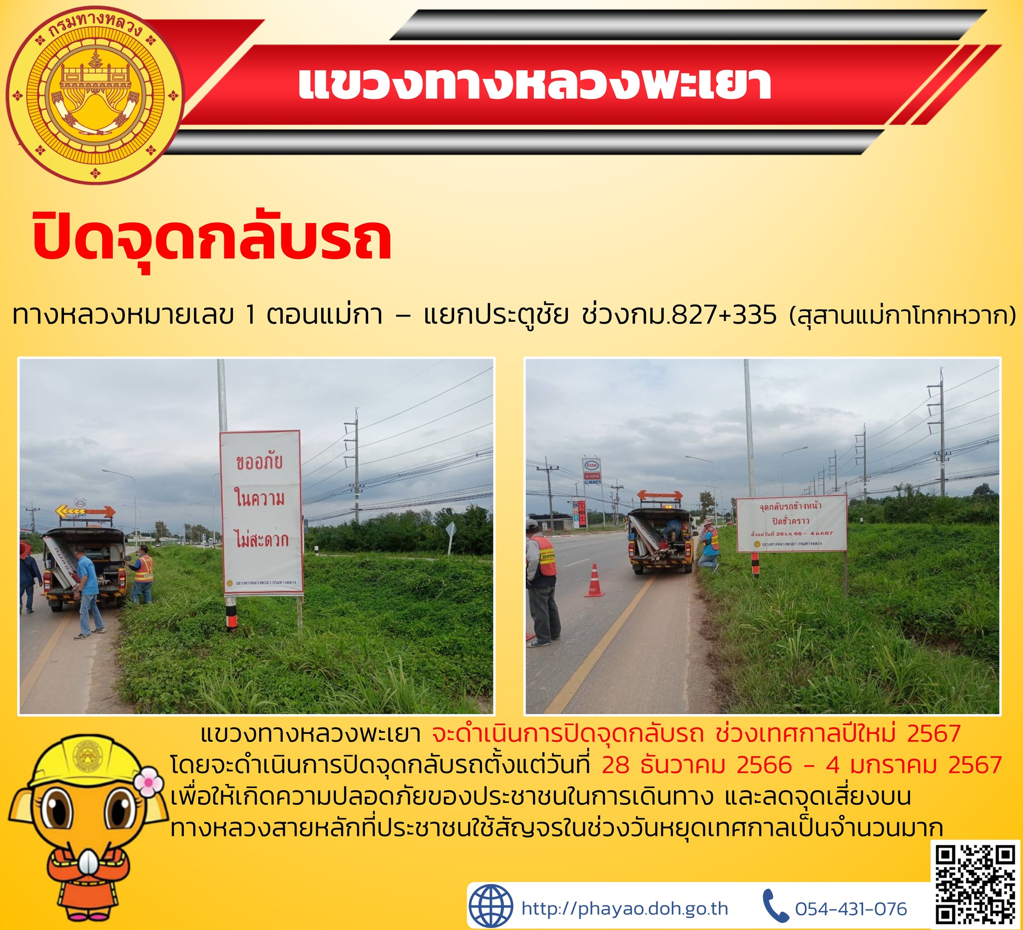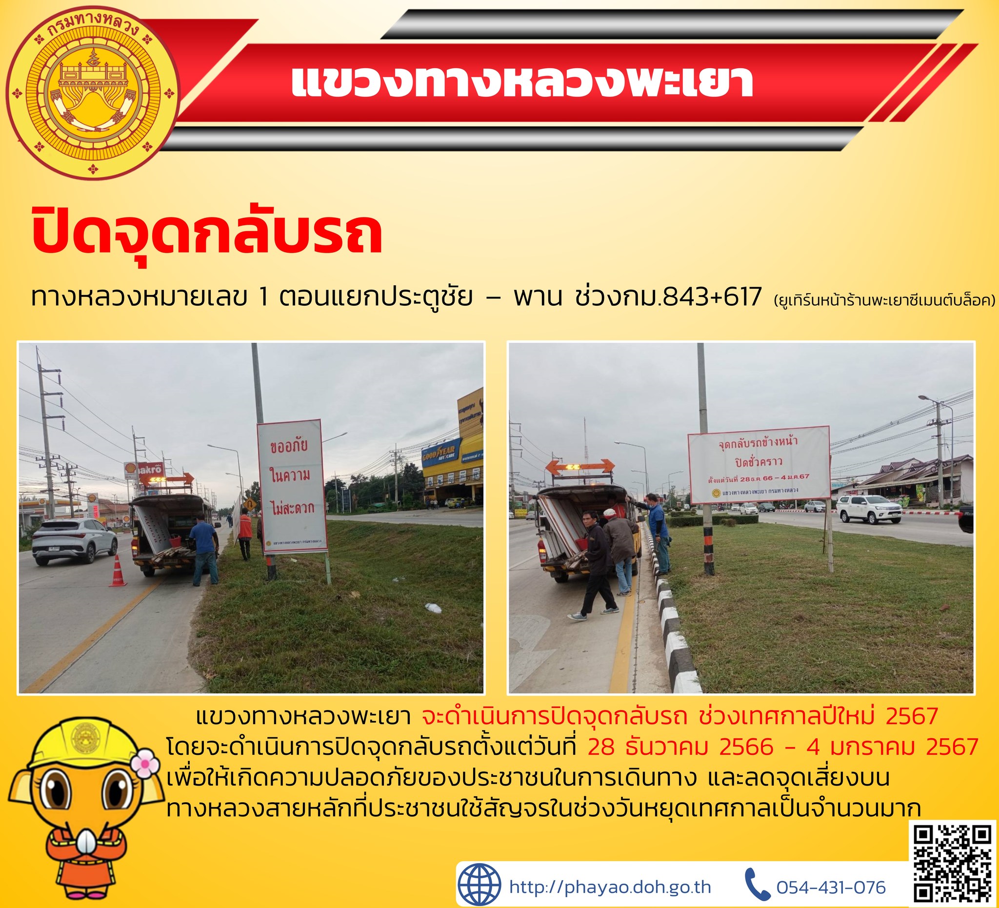 แขวงทางหลวงพะเยา จะดำเนินการปิดจุดกลับรถ ช่วงเทศกาลปีใหม่ 2567 โดยจะดำเนินการปิดจุดกลับรถ ตั้งแต่วันที่ 28 ธันวาคม 2566 - 4 มกราคม 2567 เพื่อให้เกิดความปลอดภัยของประชาชนในการเดินทาง และลดจุดเสี่ยงบนทางหลวงสายหลัก ที่ประชาชนใช้สัญจรในช่วงวันหยุดเทศกาลเป็นจำนวนมาก
