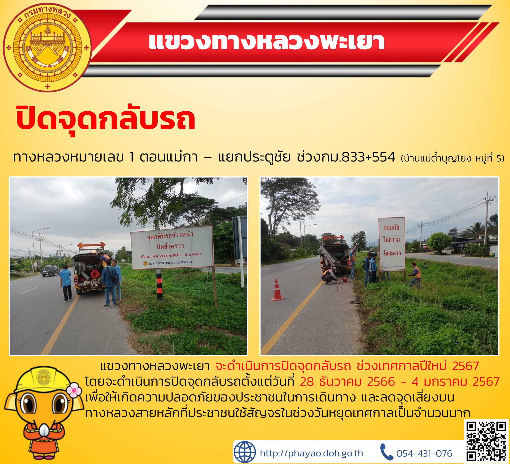แขวงทางหลวงพะเยา จะดำเนินการปิดจุดกลับรถ ช่วงเทศกาลปีใหม่ 2567 โดยจะดำเนินการปิดจุดกลับรถ ตั้งแต่วันที่ 28 ธันวาคม 2566 - 4 มกราคม 2567 เพื่อให้เกิดความปลอดภัยของประชาชนในการเดินทาง และลดจุดเสี่ยงบนทางหลวงสายหลัก ที่ประชาชนใช้สัญจรในช่วงวันหยุดเทศกาลเป็นจำนวนมาก