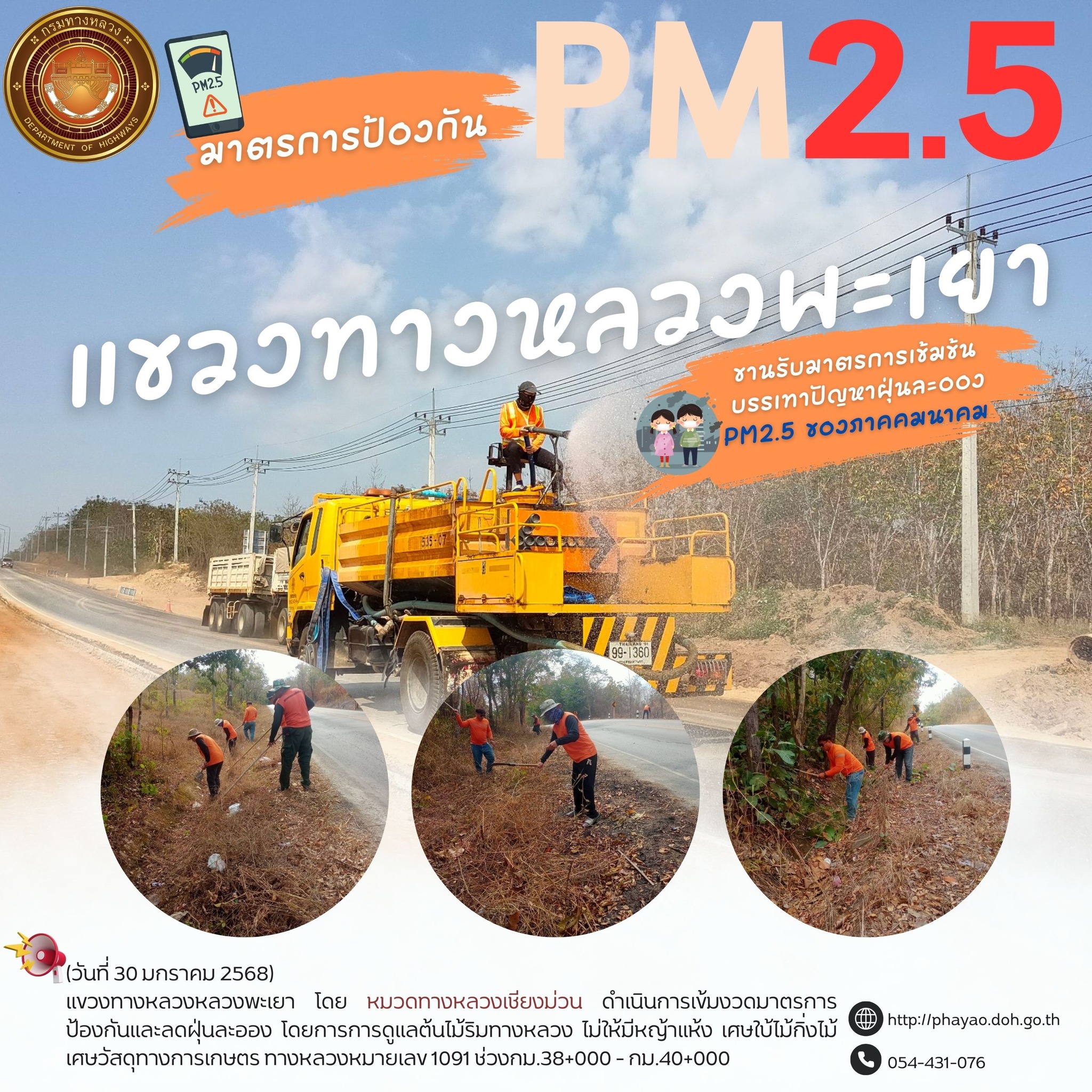 โดยหมวดทางหลวงเชียงม่วน ดำเนินการการดูแลต้นไม้ริมทางหลวง ไม่ให้มีหญ้าแห้ง เศษใบ้ไม้กิ่งไม้ เศษวัสดุทางการเกษตร ทางหลวงหมายเลข 1091 ช่วงกม.38+000 - กม.40+000 เพื่อช่วยลดปริมาณฝุ่นละอองขนาดเล็กในอากาศ ที่เป็นอันตราย และส่งผลกระทบต่อคุณภาพชีวิตของประชาชนและสิ่งแวดล้อมในพื้นที่จังหวัดพะเยา