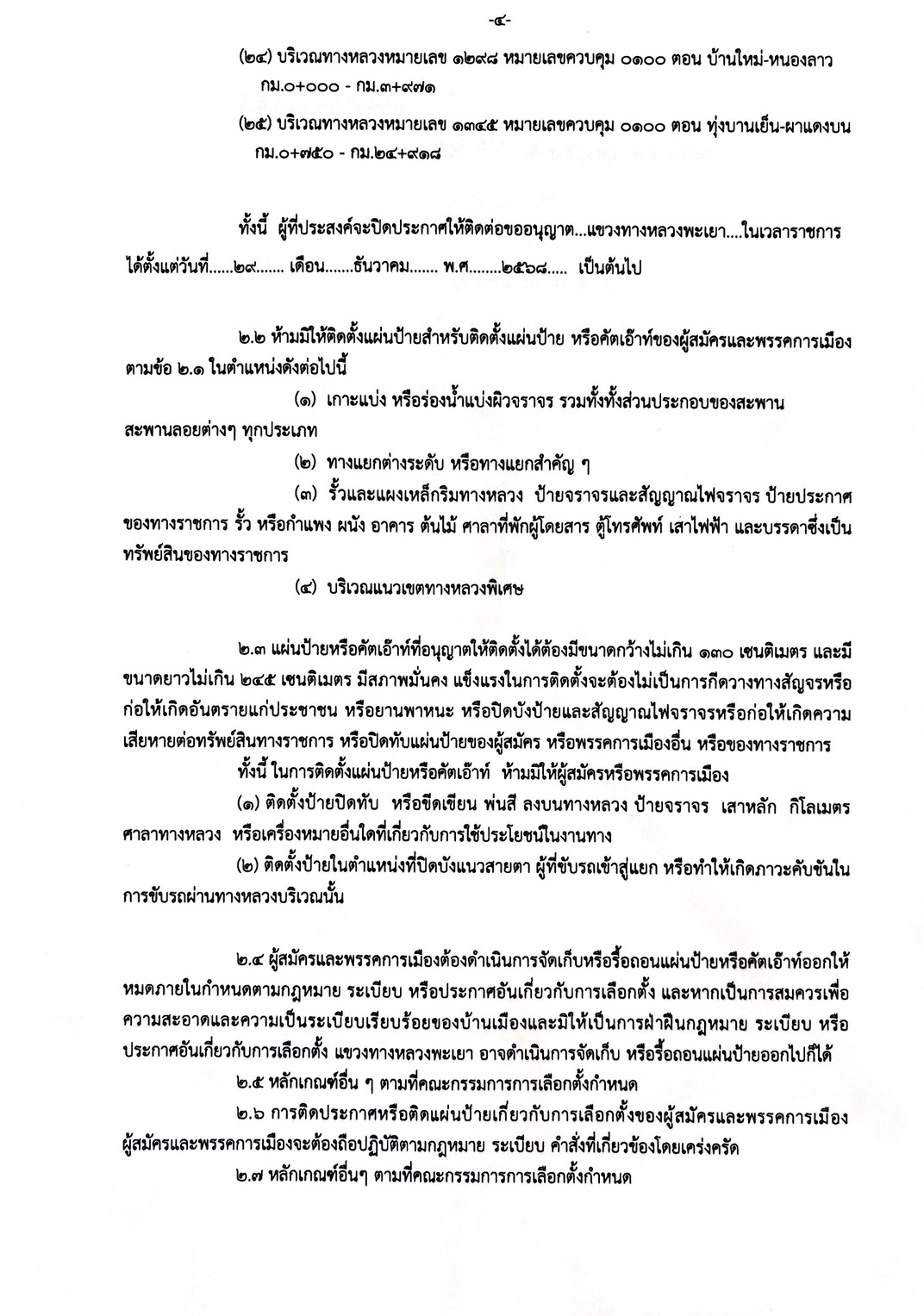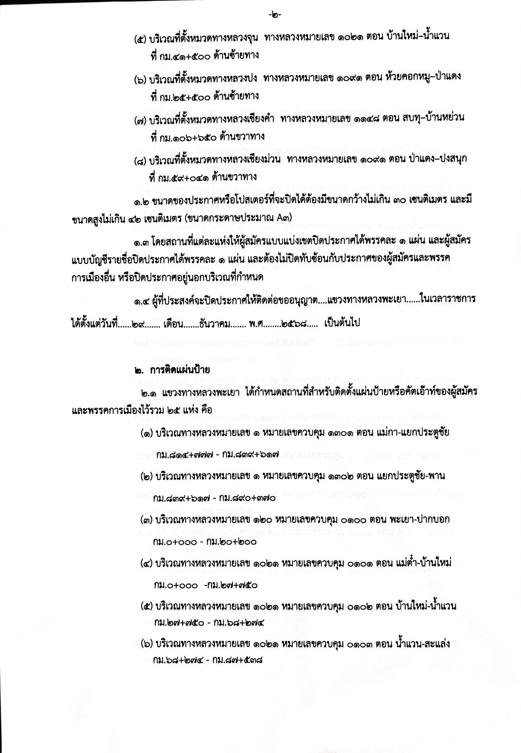 ห้ามมิให้ผู้ใดติดตั้งป้ายหาเสียงเลือกตั้งในเขตทางหลวง ก่อนวันที่ 29 ธันวาคม 2568 และต้องได้รับอนุญาตจากแขวงทางหลวงพะเยาเป็นลายลักษณ์อักษร ตามประกาศของแขวงทางหลวงพะเยา