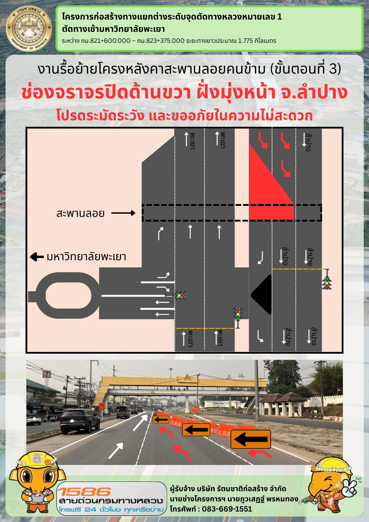 ข้อมูลข่าว : ข่าวประชาสัมพันธ์แขวงทางหลวงพะเยา เนื่องด้วยโครงการก่อสร้างทางแยกต่างระดับ จุดตัดทางหลวงหมายเลข 1 ตัดทางเข้ามหาวิทยาลัยพะเยา ทางหลวงหมายเลข 1 ตอน แม่กา - แยกประตูชัย ระหว่าง กม.821+600 - กม.823+375 จะดำเนินการถอดรื้อหลังคาสะพานลอย ในวันที่ 7 - 8 เมษายน 2569 จึงขอประชาสัมพันธ์งดใช้สะพานลอยคนเดินข้ามดังกล่าวชั่วคราว เป็นระยะเวลา 2 วัน เพื่อความปลอดภัยของผู้ใช้สะพาน และผู้ใช้เส้นทางสัญจร ดังกล่าว